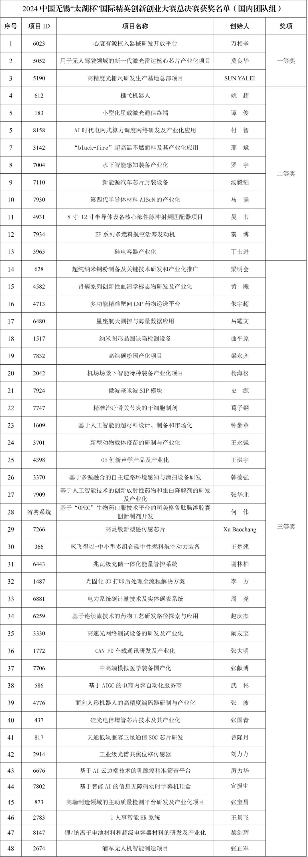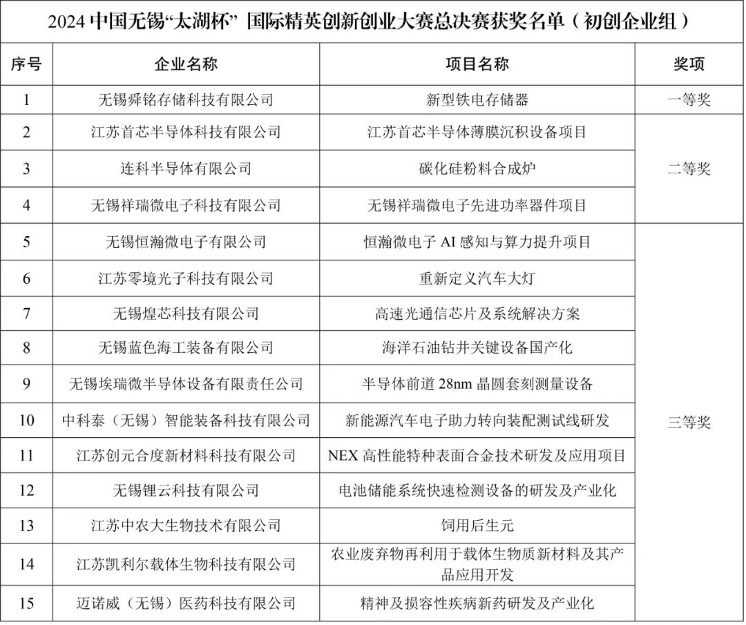 2024中国无锡“太湖杯”国际精英创新创业大赛总决赛于12月12日-13日顺利举行。本次大赛成功吸引了7160个国内外创业团队以及494家本地企业报名参赛,覆盖七大战略性新兴产业领域。历经25场复赛选拔,共有66个团队项目和30个企业项目通过尽职调查并经综合评审成功晋级总决赛,分4个组别进行路演答辩。经大赛组委会研究,决定对晋级总决赛的项目根据成绩分别授予一等奖、二等奖和三等奖。