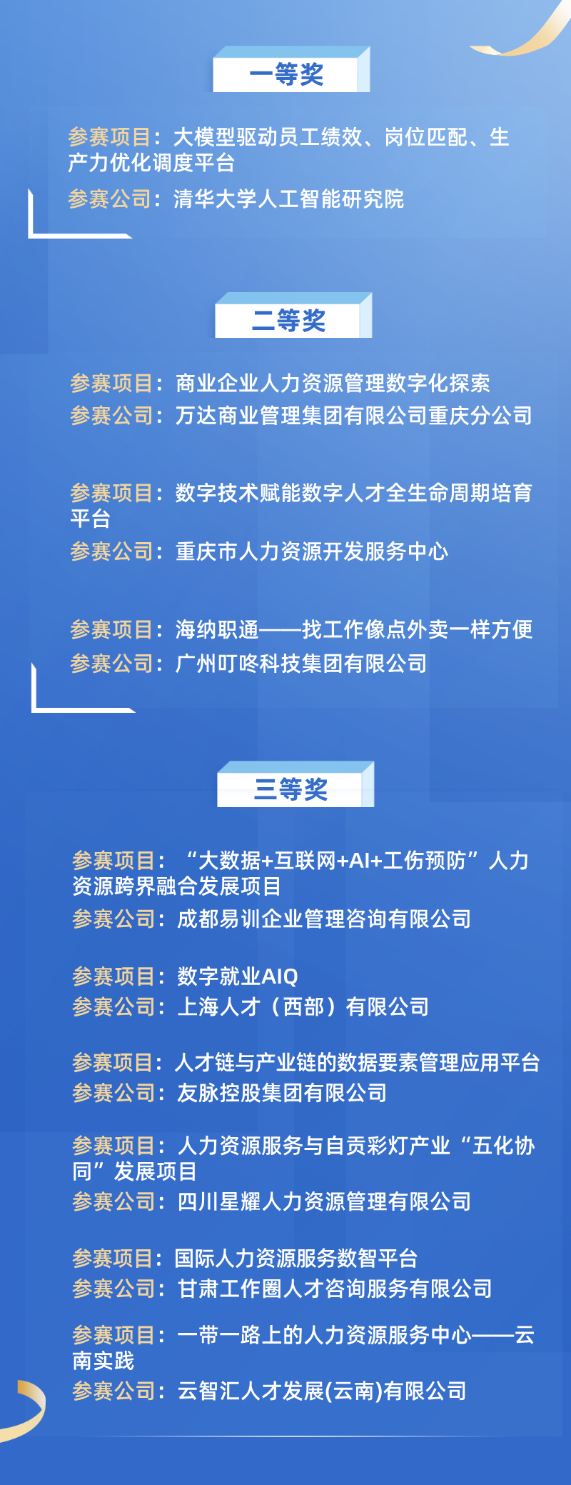 大赛自11月18日启动以来,吸引了来自北京、上海、广东、重庆、甘肃、青海、宁夏等多地人力资源服务企业共计102个项目参赛,涵盖零工市场建设、劳务品牌培育、AI智能招聘、大模型驱动员工绩效调度、人才链与产业链数据要素管理等多业态服务项目。经过初评、复选,22个项目进入决赛,通过项目答辩、专家评审等,最终这些项目获一、二、三等奖。