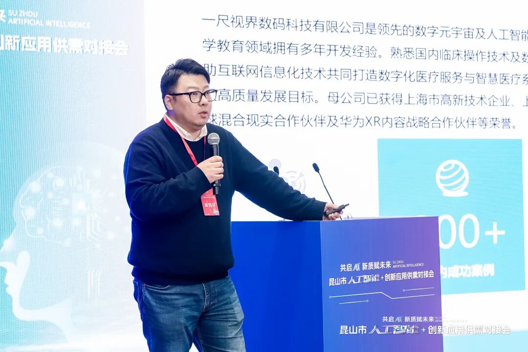 在对接会人工智能场景案例分享环节,昆山工业元宇宙应用中心入驻企业——苏州一尺视界数码科技有限公司CEO杜浩然带来了题为《人工智能+医疗:一尺方舟医学AI大模型》的精彩案例分享。杜总详细介绍了一尺方舟医学AI大模型在医疗领域的应用,展示了人工智能技术如何助力医疗行业的发展与创新。