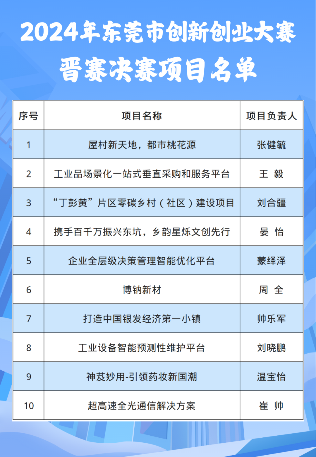 12月18日,大赛组委会组织专家团通过书面评审方式对报名参赛项目围绕团队实力、项目创新及可行性、行业及市场前景、商业模式及发展规划、财务情况等维度进行了严格评审,择优评出10个项目晋级决赛。