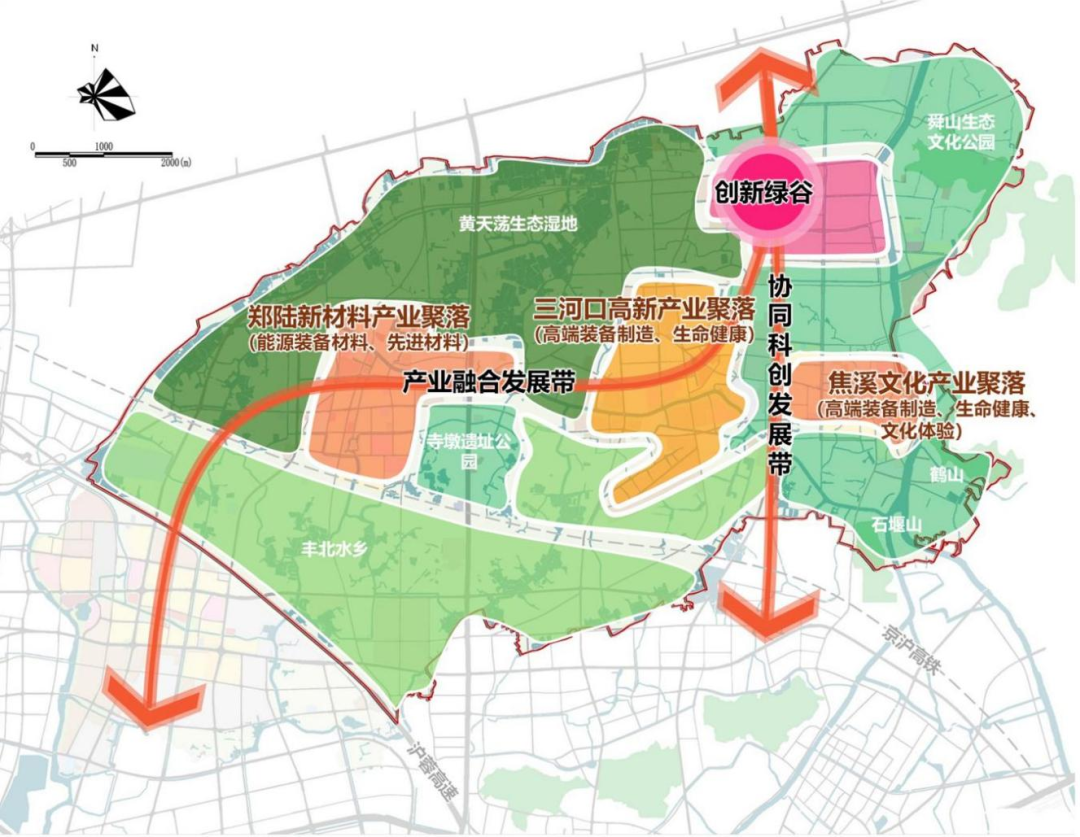 即郑陆新材料产业聚落、三河口高新产业聚落、焦溪文化产业聚落。