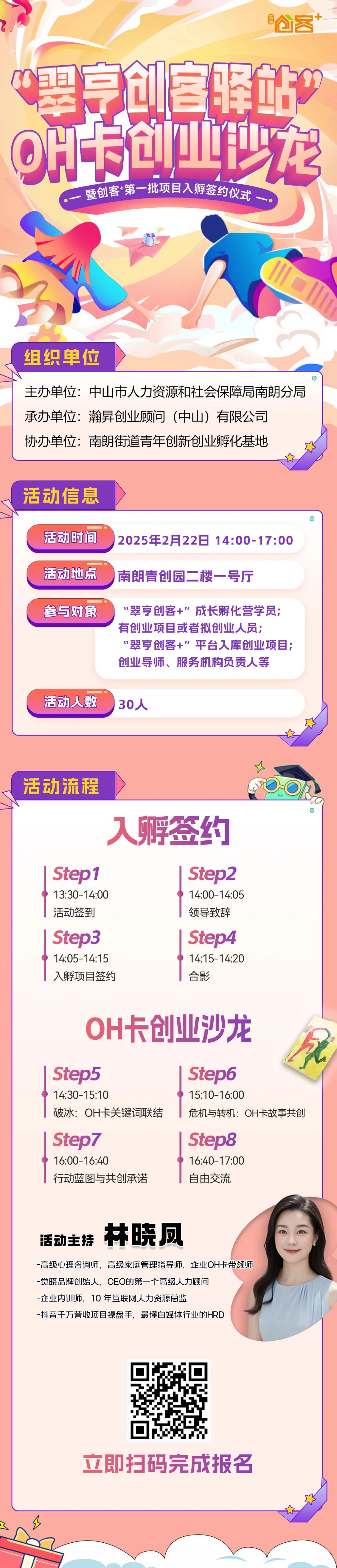 你是否怀揣创业梦想,却找不到方向?是否渴望结识志同道合的伙伴,整合优质资源?现在,机会来了!由中山市人力资源和社会保障局南朗分局主办的“翠亨创客驿站”OH卡创业沙龙暨第一批项目入孵签约仪式即将开启,诚邀你的参与!