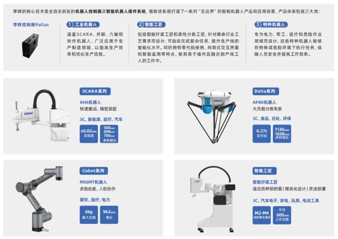 在大疆的供应链上,很容易找到东莞松山湖企业的身影。李群自动化是国内第一家、全球第二家拥有全品类工业机器人的企业,专注于轻量型高端工业机器人研发生产,致力于为企业提供机器人产品与整体解决方案。