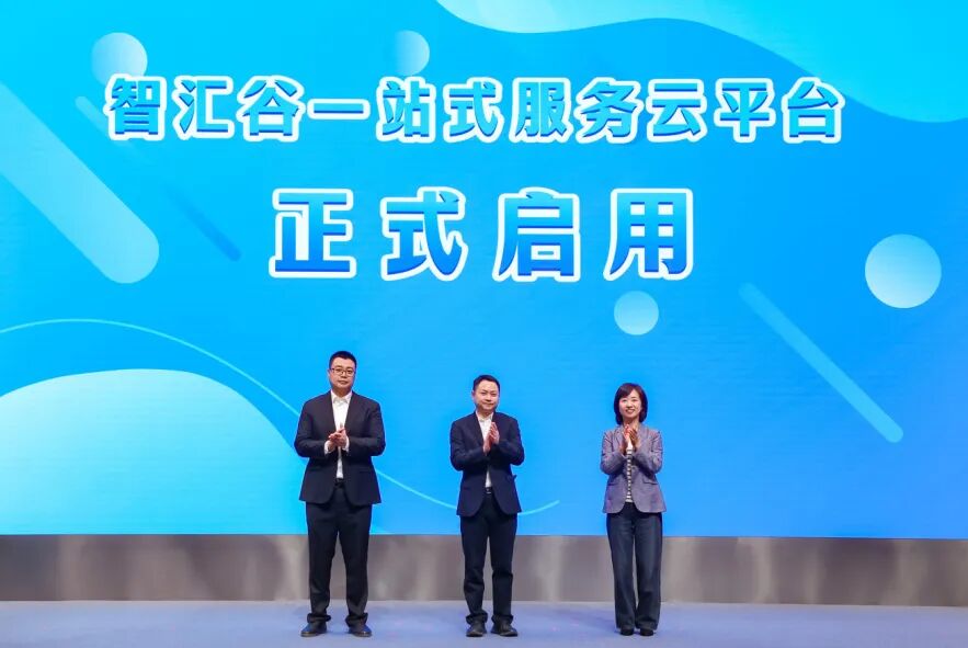 市委组织部副部长高中亚、市工信局副局长郁晓蓉、文教投集团副总经理贺寅共同启用智汇谷一站式服务云平台,为企业提供更加便捷高效的服务渠道。