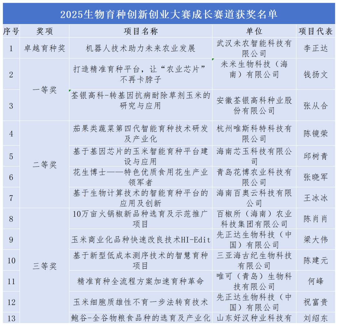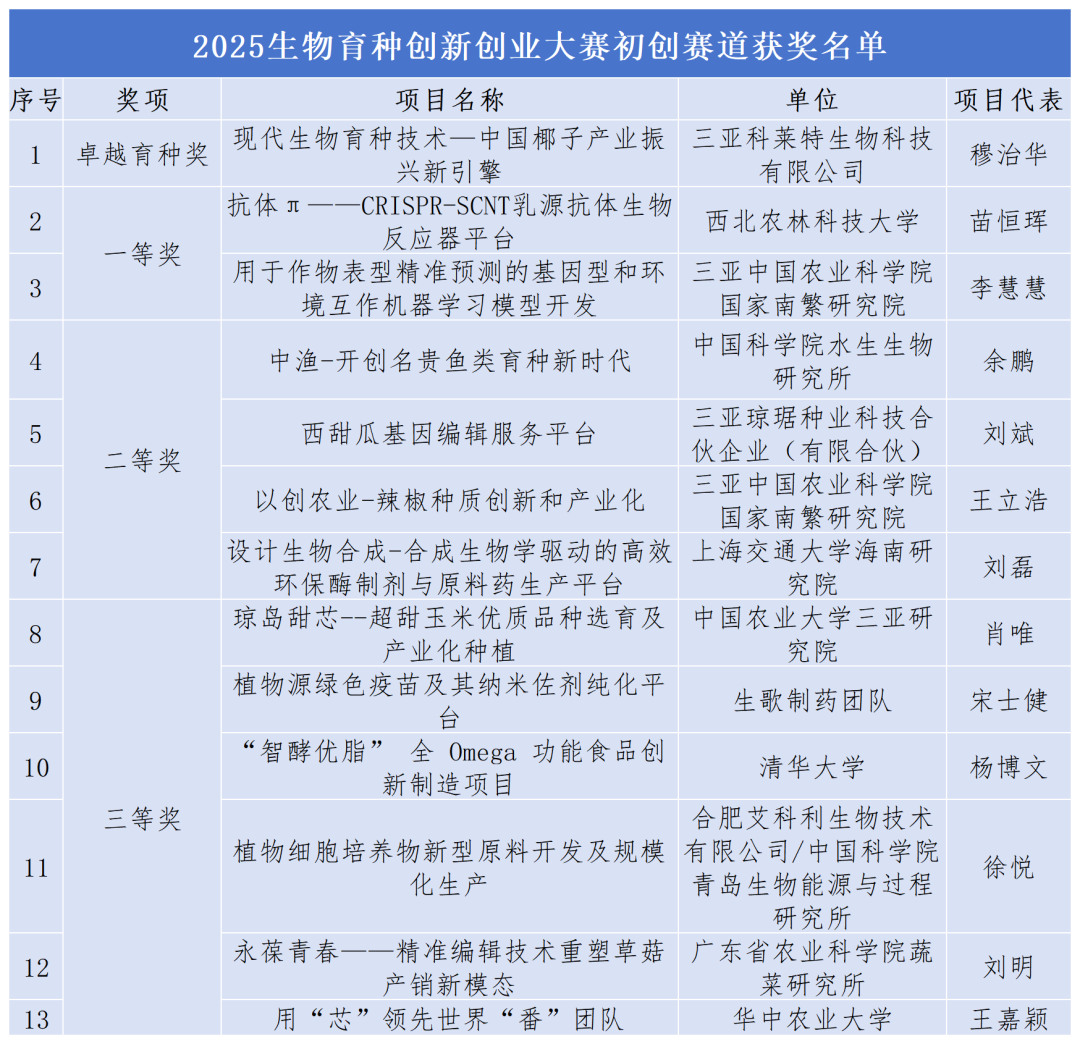 3月19日,决赛在崖州湾科技城入驻高校中国农业科学院国家南繁研究院举行。经过评委们的专业评审,最终评选出卓越育种奖2名、一等奖4名,二等奖8名、三等奖12名以及优胜奖14名,并有19个项目计划落地崖州湾科技城。本次大赛主要获奖名单如下