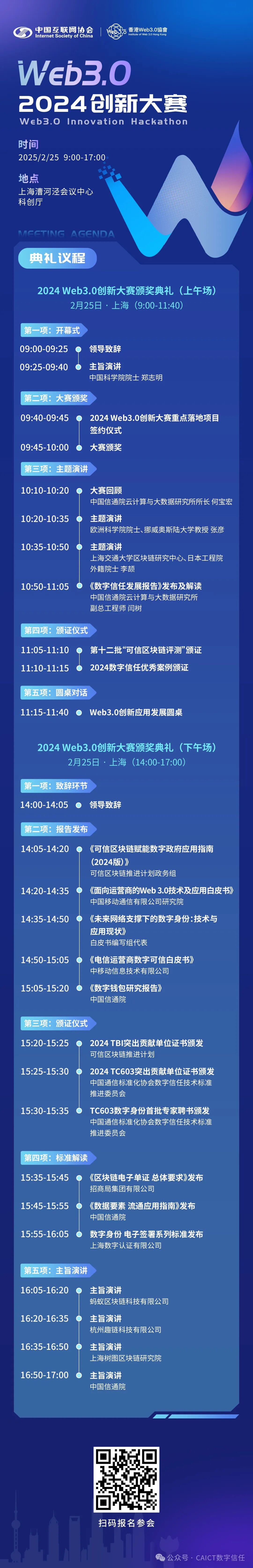 为积极响应国家政策,抢抓Web3.0发展历史机遇,以数字技术和实体经济深度融合为主线,以Web3.0重点领域先行先试为牵引,由中国互联网协会、香港Web3.0 协会联合主办的2024 Web3.0创新大赛颁奖典礼将于2月25日在上海正式举行,为大赛优胜团队颁奖,并围绕Web3.0、数字身份、数字信任等关键议题,发布重磅研究成果,邀请业内产学研专家共话技术、产业、生态新进展。