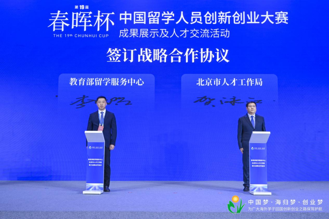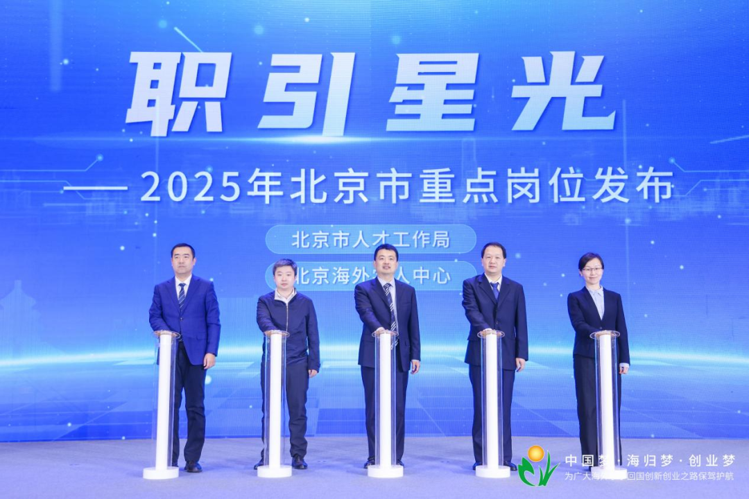 开幕式期间,教育部留学服务中心与北京市人才工作局签订战略合作协议。嘉宾共同为“北京市留学人员实习基地”揭牌。同时发布了“职引星光”2025年北京市重点岗位。