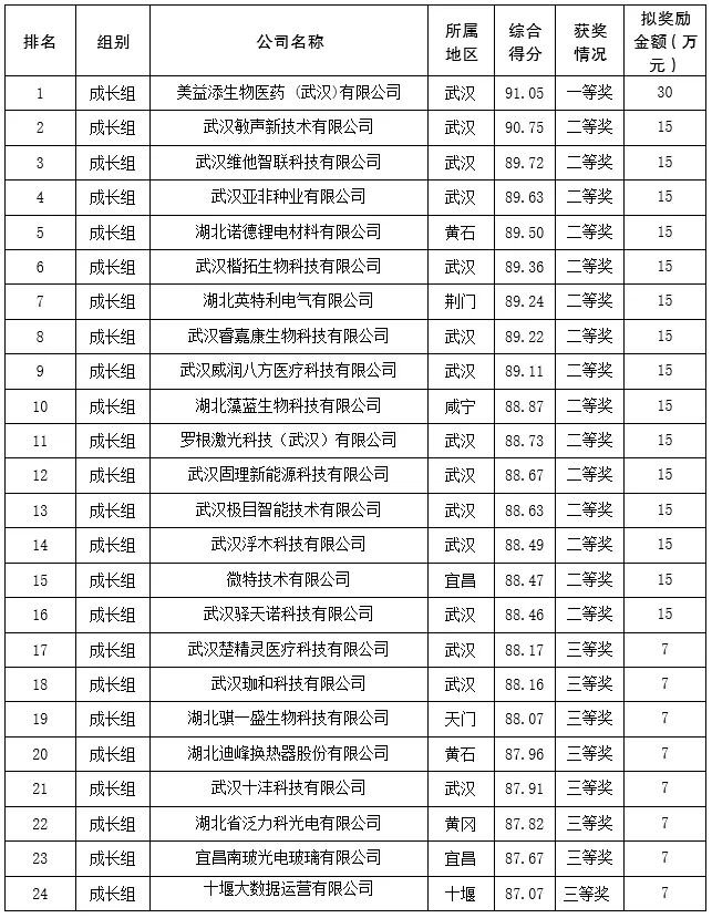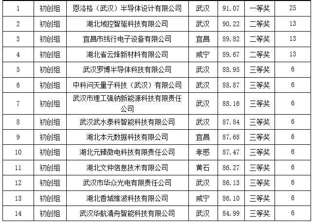 根据《工信部火炬中心关于举办第十三届中国创新创业大赛的通知》(火炬〔2024〕8号)和《关于举办第十三届中国创新创业大赛(湖北赛区)的通知》(鄂科技通〔2024〕43号)要求,湖北省科技厅举办了第十三届中国创新创业大赛(湖北赛区)。省科技厅结合比赛成绩排序,决定对已通过公示的第十三届中国创新创业大赛(湖北赛区)决赛获奖企业给予奖励支持,现将结果予以公布。
