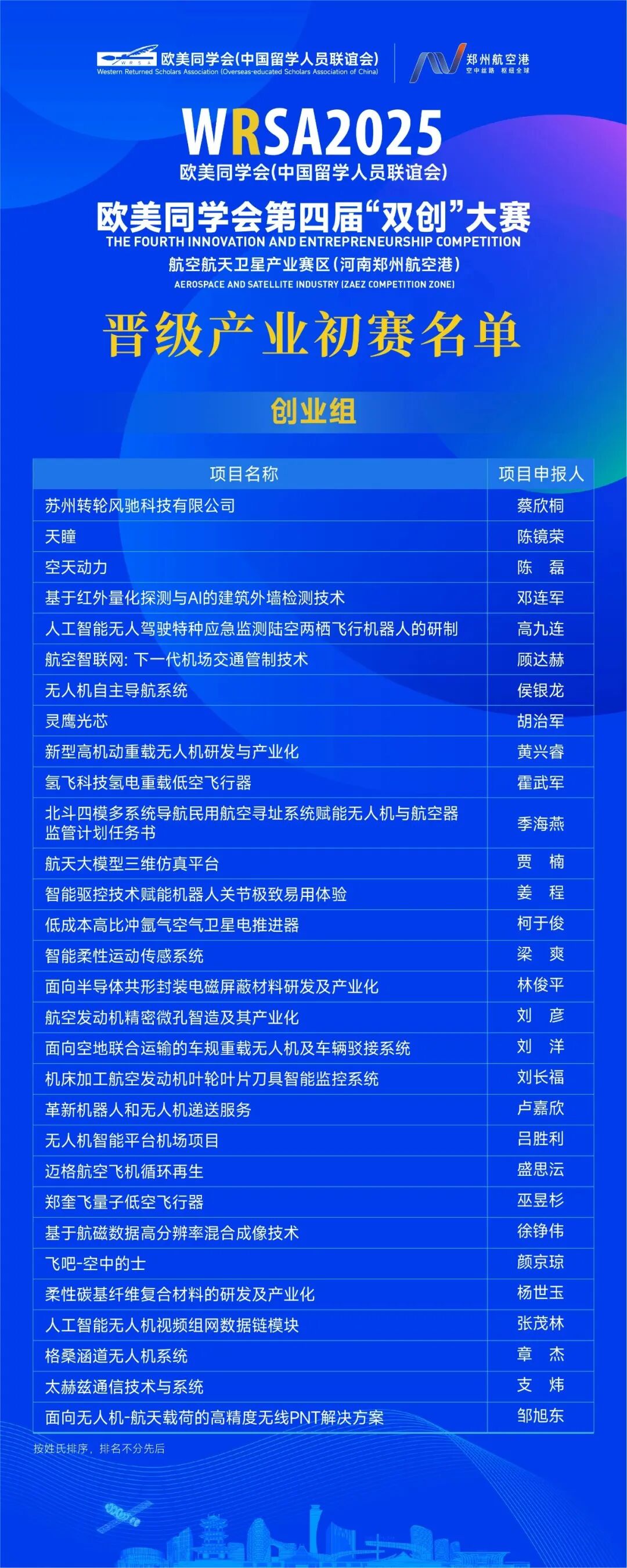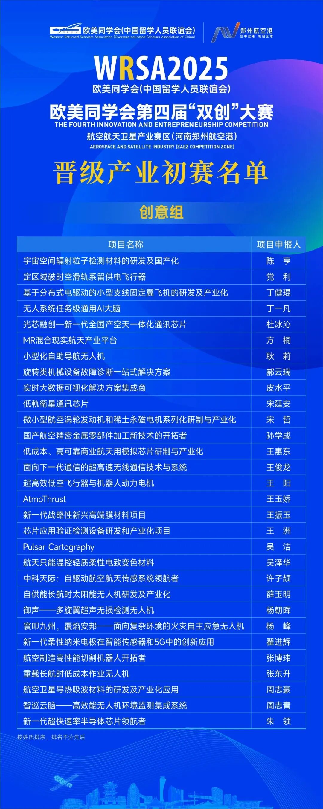 经过线上评审,欧美同学会第四届双创大赛航空航天卫星产业赛区共计60个项目晋级产业初赛,其中创意组30个,创业组30个。现将结果予以公布。