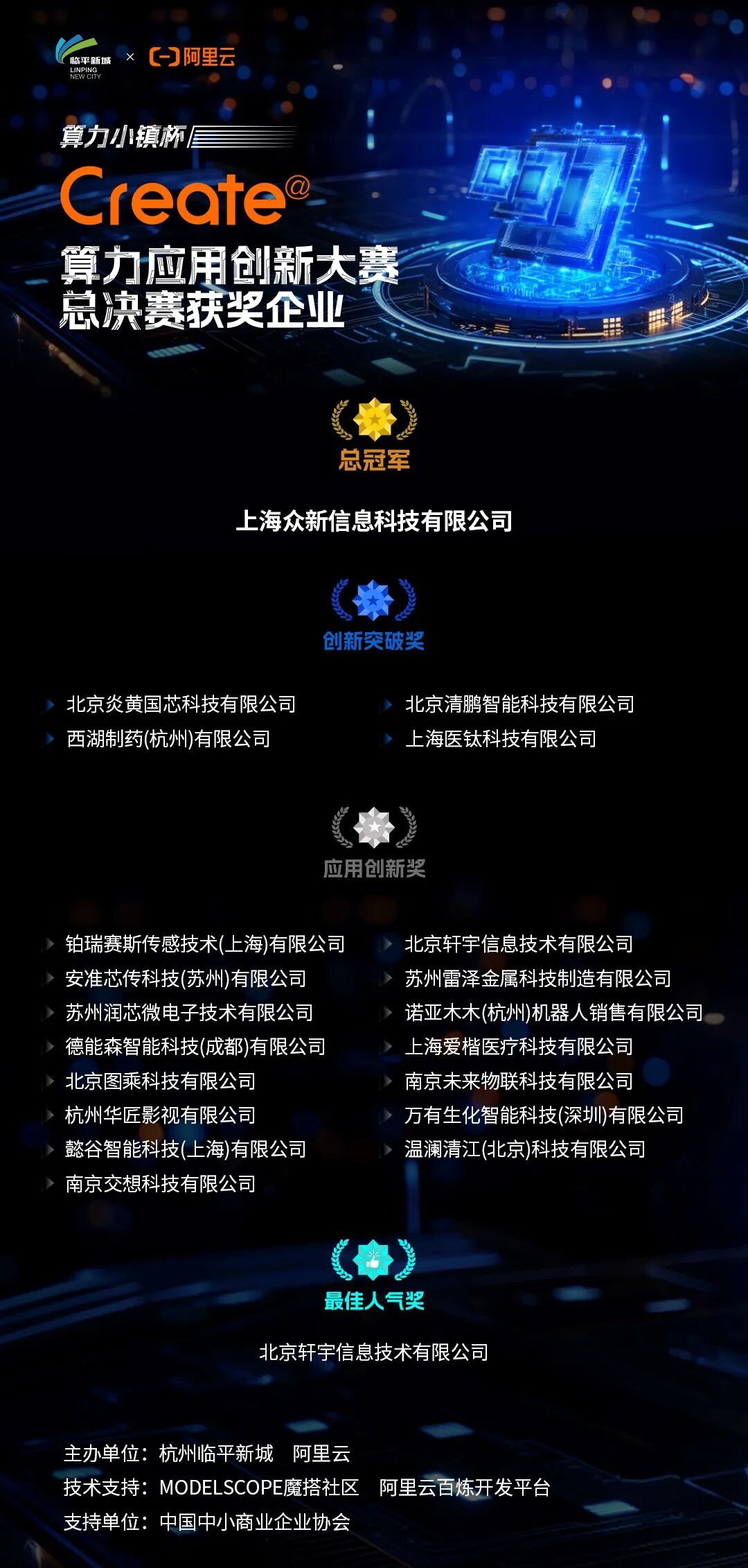 12月4日,由杭州临平新城与阿里云联合举办的“算力小镇杯”Create@算力应用创新大赛(以下简称“算力应用创新大赛”)正式闭幕。现场共有20家来自算力+新消费、算力+先进制造、算力+医疗健康、算力+文化娱乐、算力+多元发展等多个维度的企业参与决赛环节,其中上海众新信息科技有限公司获得总冠军,北京轩宇信息技术有限公司获得最佳人气奖,北京炎黄国芯科技有限公司、北京清鹏智能科技有限公司、西湖制药(杭州)有限公司、上海医钛科技有限公司4家企业获得创新突破奖,铂瑞赛斯传感技术(上海)有限公司、北京轩宇信息技术有限公司、安准芯传科技(苏州)有限公司、苏州雷泽金属科技制造有限公司、苏州润芯微电子技术有限公司、诺亚木木(杭州)机器人销售有限公司、德能森智能科技(成都)有限公司、上海爱楷医疗科技有限公司、北京图乘科技有限公司、南京未来物联科技有限公司、杭州华匠影视有限公司、万有生化智能科技(深圳)有限公司、懿谷智能科技(上海)有限公司、温澜清江(北京)科技有限公司、南京交想科技有限公司15家企业获得应用创新奖。