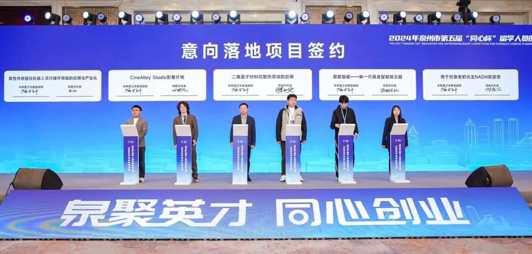 作为福建首个留学人员的创新创业专业品牌赛事,泉州市“同心杯”留学人员创新创业大赛已经成为泉州市招才引智、拓展合作的一张“金名片”。第五届大赛自11月启动以来,吸引了自海内外130个项目报名。经过初评、复评、半决赛和尽职调查等环节的严格筛选,最终有19个优质项目脱颖而出并晋级决赛。这些项目涉及电子信息、生命健康、新材料等新质生产力和未来产业领域,其中不少项目已实现营收突破千万,完成千万级别融资,兼具“含新量”和“含金量”。经过决赛激烈的角逐,最终“柔性传感器在机器人灵巧操作领域的应用与产业化”“纳米银半导体碳化硅封装产业化”项目分别获得本届大赛初创组和孵化组的金奖。