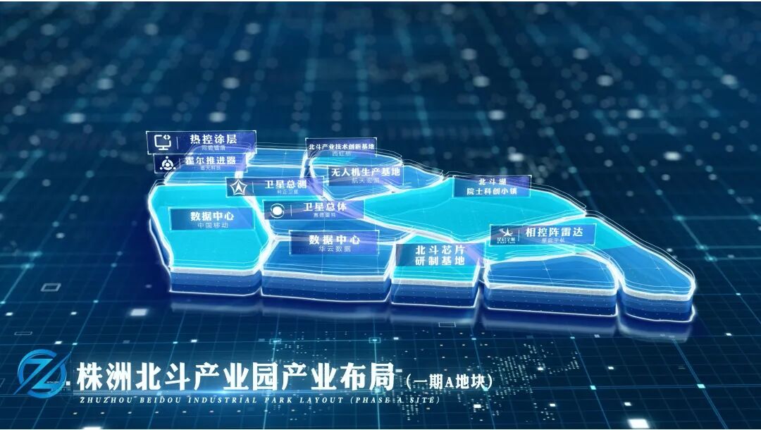 株洲北斗产业园产业布局(一期A地块):北斗芯片研制基地、数据中心(华云数据)、数据中心(中国移动)、卫星总体(赛德雷特)、卫星总测(利正卫星)、霍尔推进器(遨天科技)、热控涂层(同裘镭盾)、北斗产业技术创新基地(西虹桥)、无人机生产基地(航天宏图)、相控阵雷达(星启宇航)、北斗湖时空信息科技园。