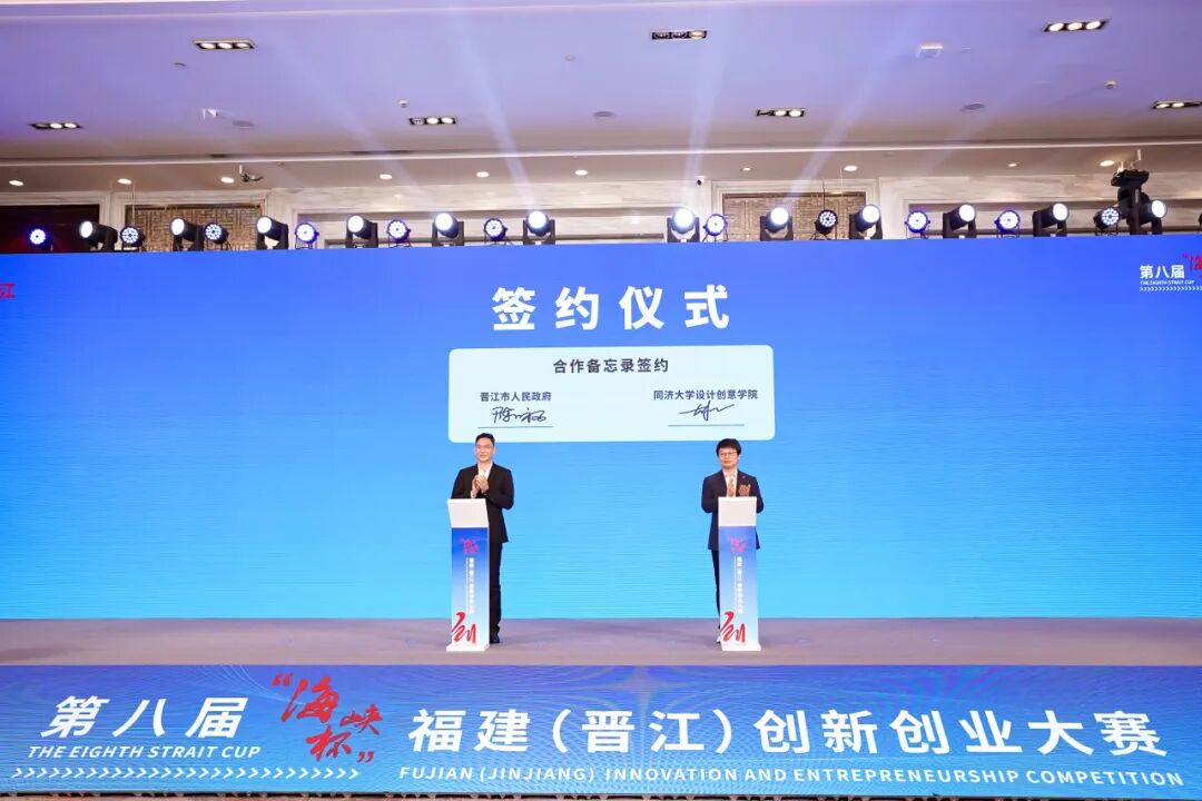 签约仪式上,晋江市人民政府与同济大学设计创意学院签订合作备忘录,还与大赛一、二、三等奖项目签订意向落地协议。