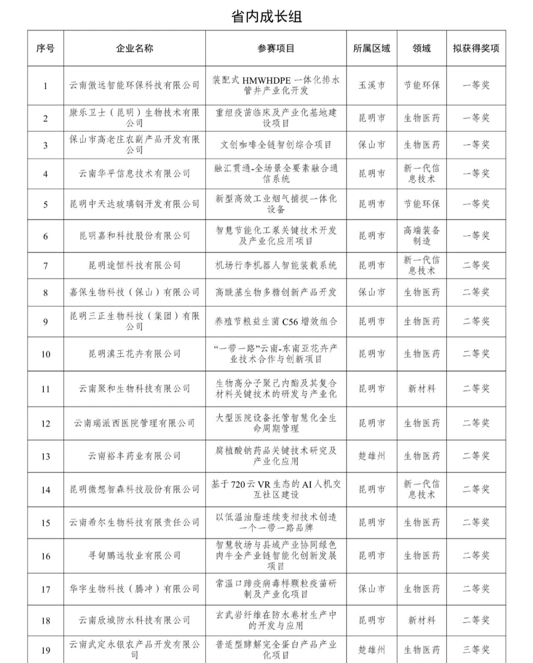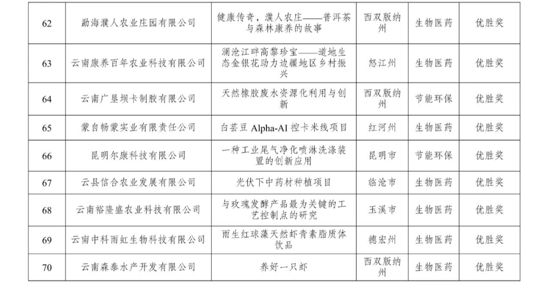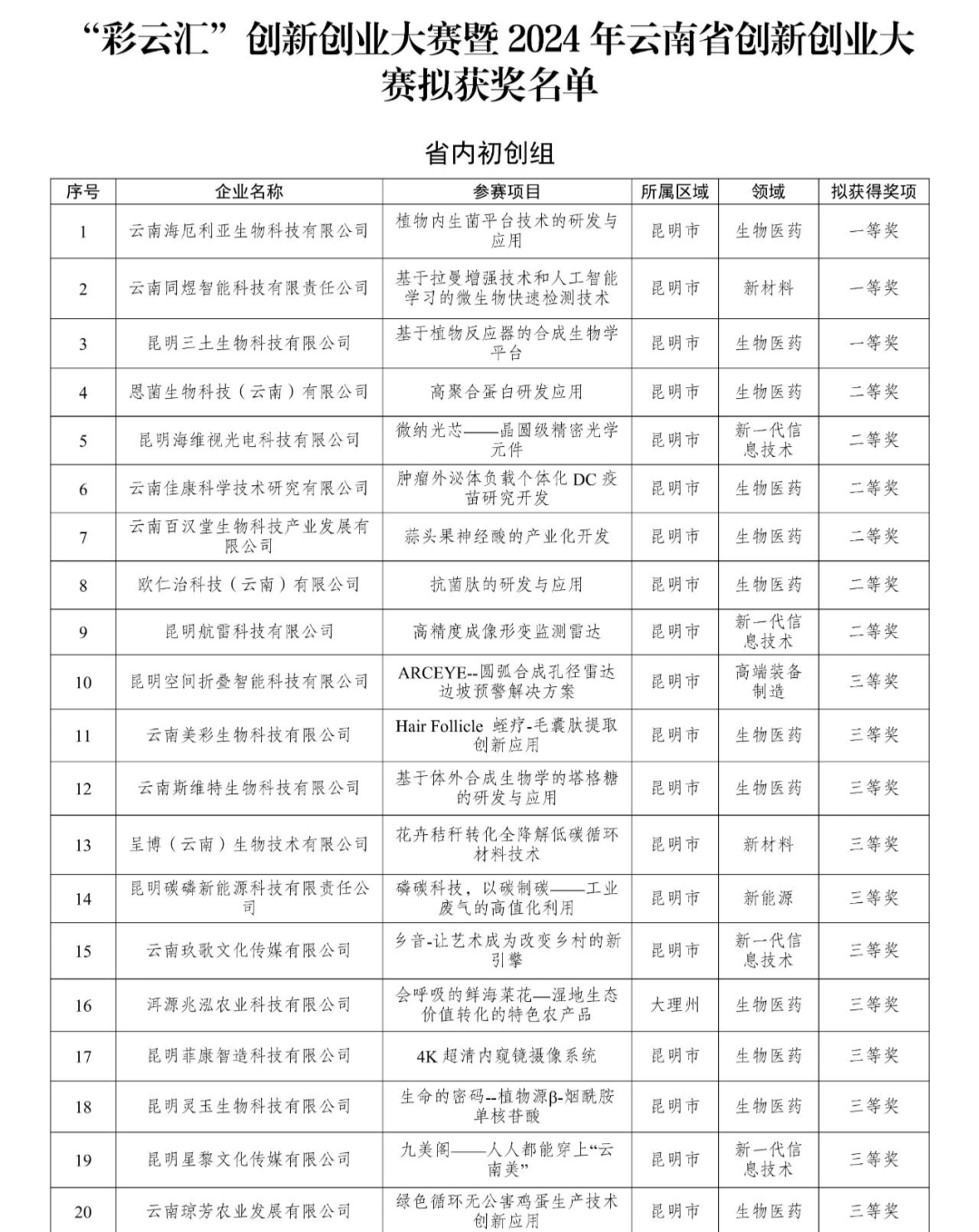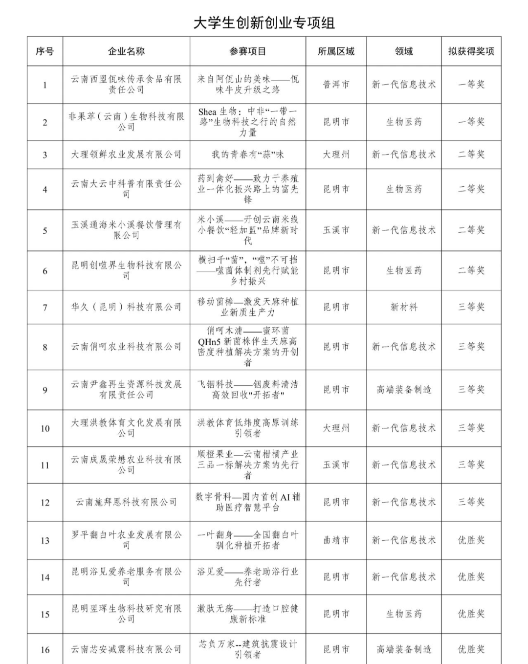 云南省科技厅共青团云南省委 云南省教育厅关于“彩云汇”创新创业大赛暨2024年云南省创新创业大赛拟获奖名单的公示