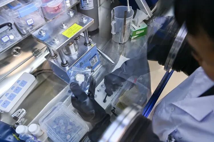 ▲重庆新型储能材料与装备研究院电池组装实验室,研发人员正在组装镁电池。