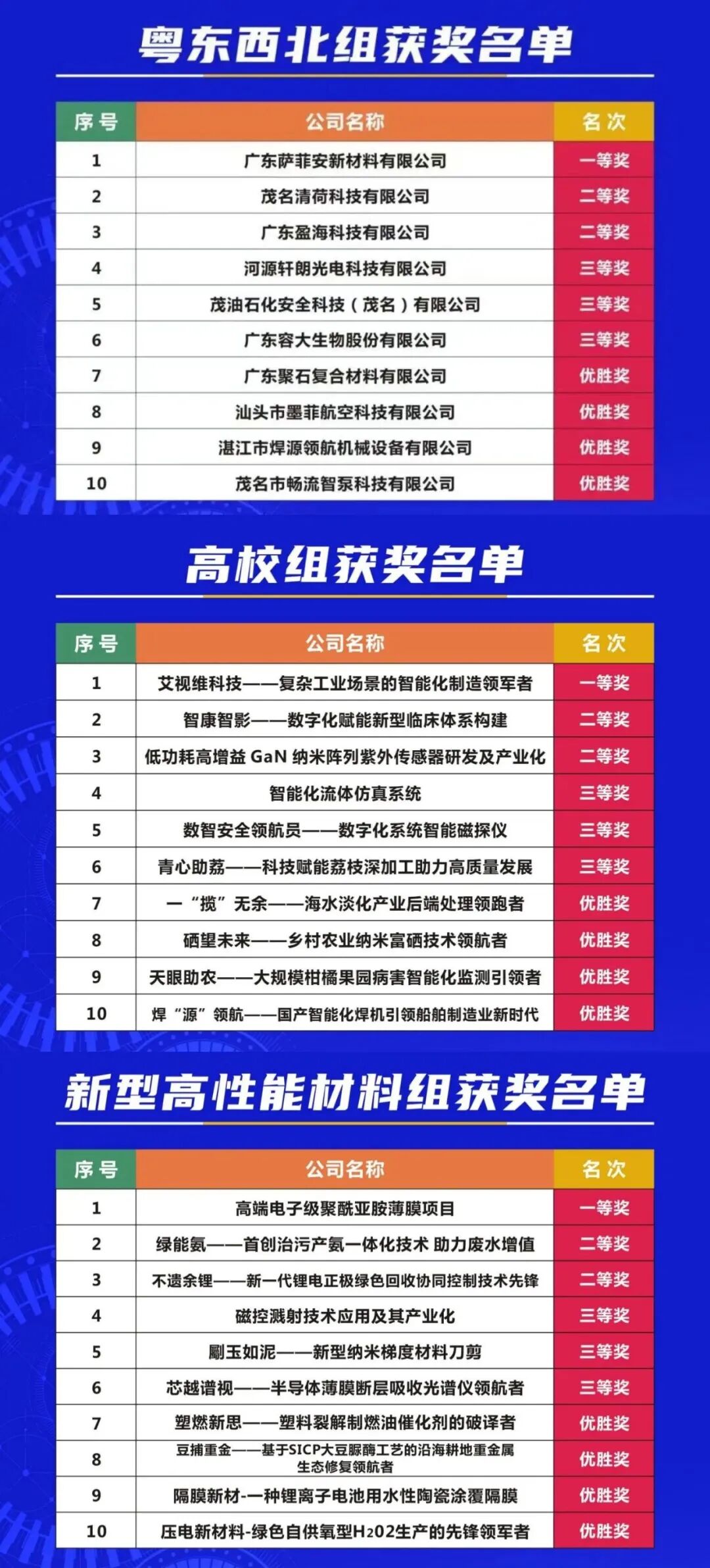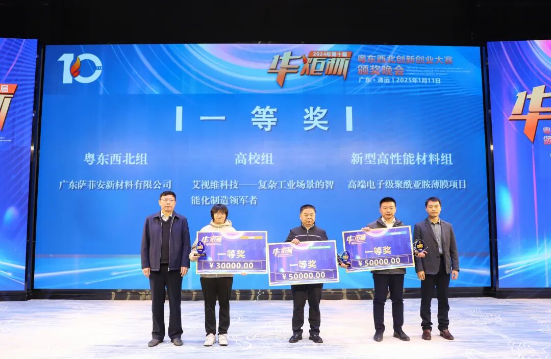 经过激烈角逐,广东萨菲安新材料有限公司获粤东西北组一等奖,艾视维科技——复杂工业场景的智能化制造领军者获高校组一等奖,高端电子级聚酰亚胺薄膜项目获新型高性能材料组一等奖。
