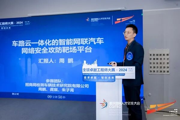 在创新挑战组别的智能网联新能源汽车专业组,来自招商局检测车辆技术研究院有限公司的团队带来了“车路云一体化的智能网联汽车网络安全攻防靶场平台”项目路演。