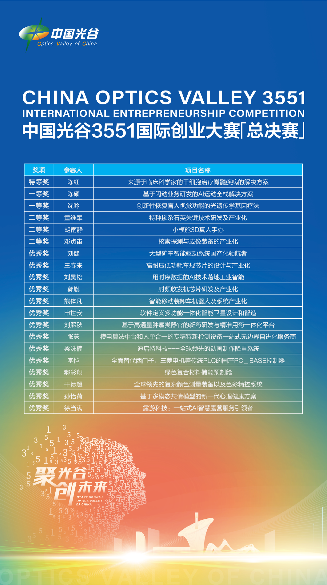 中国光谷3551国际创业大赛自2015年启动以来,至今已举办9届,连续7年入选人社部“海外赤子为国服务计划”,成为湖北乃至全国知名的创业活动品牌,培育出天眸光电、巨安储能、美益添生物、慧观生物等一批优秀创业企业。永不落幕的大赛还将继续,2025年期待更多英才与光谷形成发展的合伙人,奋斗的共同体,共享机遇、共筑梦想、共赢未来!