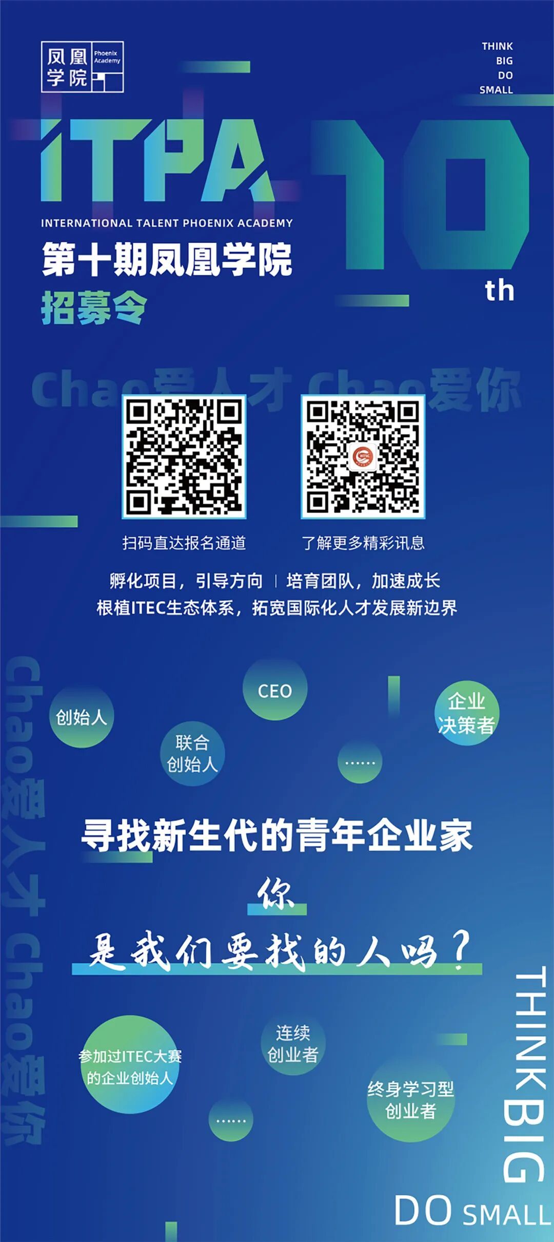 凤凰学院作为朝阳区国际人才培养服务品牌,以“凤凰计划”和朝阳国际人才创业大会(ITEC)多年聚集的人才、技术、资本、产业等优质资源为依托打造科学家创业特训,挖掘培养一批极具创新能力和国际化视野的青年企业家。目前第十期正在火热报名中,重点征集符合朝阳区重点产业发展方向、具有高成长潜力的公司或创业项目主要创始人参与,ITEC全球创业赛三等奖及以上获奖项目创始团队成员可直接入选(仅限1名),优胜奖创始团队成员可优先入选。