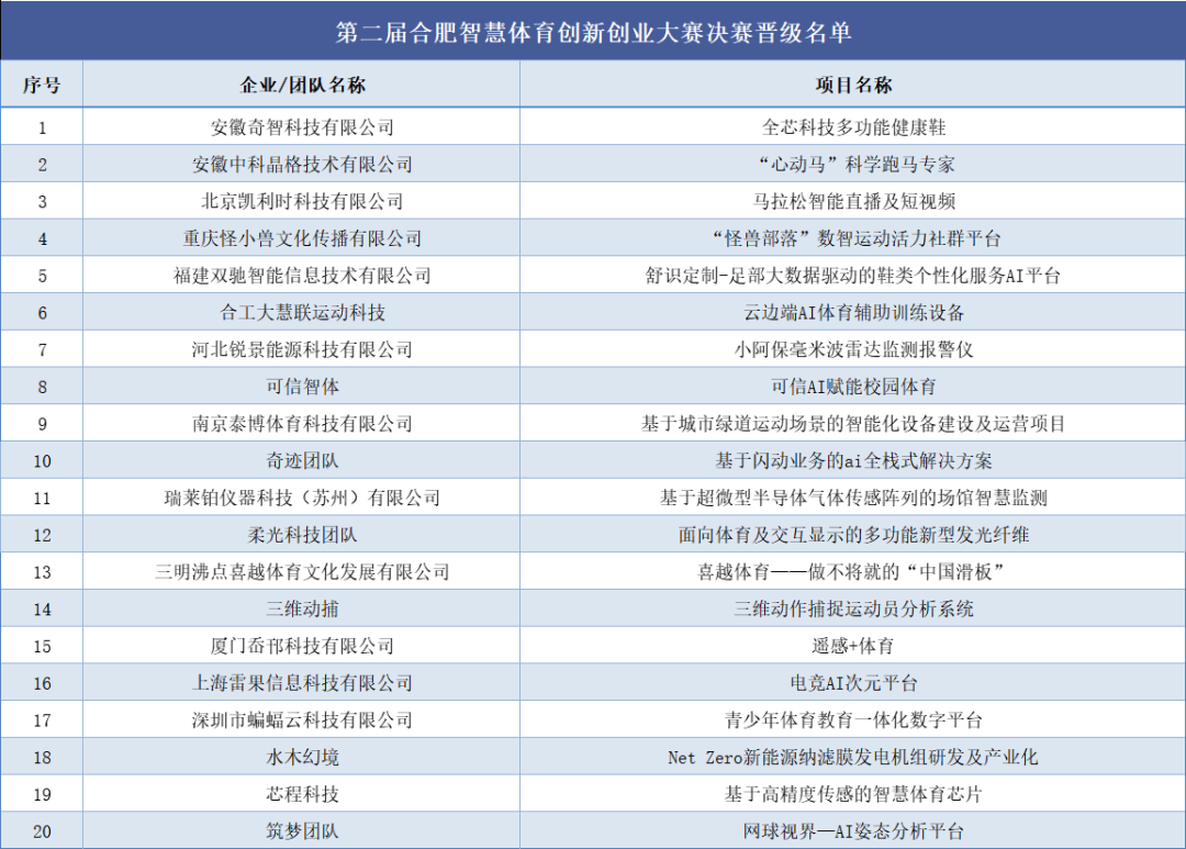 根据第二届合肥智慧体育创新创业大赛赛程安排,复赛已于2024年12月10日举行。经过初赛选拔,有50家企业和创业团队的项目进入复赛。复赛采取线上线下相结合的方式进行,即参赛团队线上路演,评审线下集中评审。复赛评审组由5名专家评委组成,按照评委评分结果,现对晋级决赛的20家企业和创业团队进行公示,公示期为2024年12月11-17日。