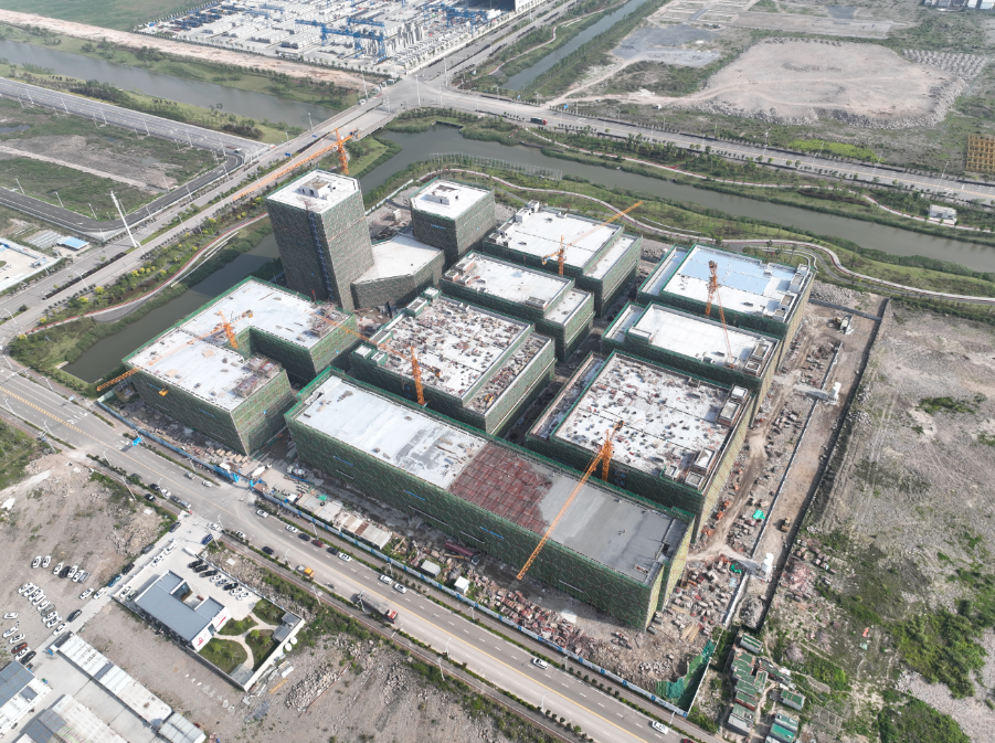 走进台州湾e车谷数字科技产业项目施工现场,只见塔吊林立,数幢现代化厂房已拔地而起,施工建设热火朝天。在11号楼楼顶,混凝土泵车伸展长臂直指云端,混凝土从管道中源源不断地倾泻而下,落在模板内的钢筋骨架中,工人们手持工具,对铺整后的混凝土进行抹平作业,确保混凝土表面平坦。
