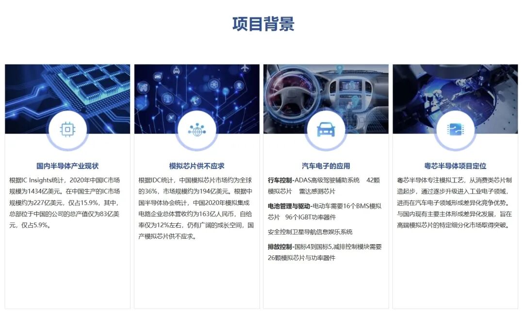 目前,企业专注于物联网、汽车电子、工业控制、5G等应用领域。根据规划,粤芯半导体项目计划分为三期进行,待全部完成投产后,将实现月产近8万片12英寸晶圆的高端模拟芯片制造产能规模,满足大湾区制造业的功率分立器件、电源管理芯片、混合信号芯片、图像传感器、射频芯片、微控制单元等芯片需求。