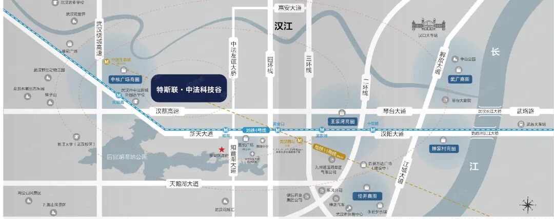交通:汉蔡高速、知音湖大道双干线衔接武汉经开与临空港两大国家级开发区,地铁4号线知音站800米,11号线(规划)提升辐射力。