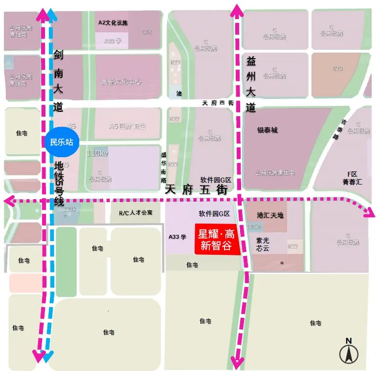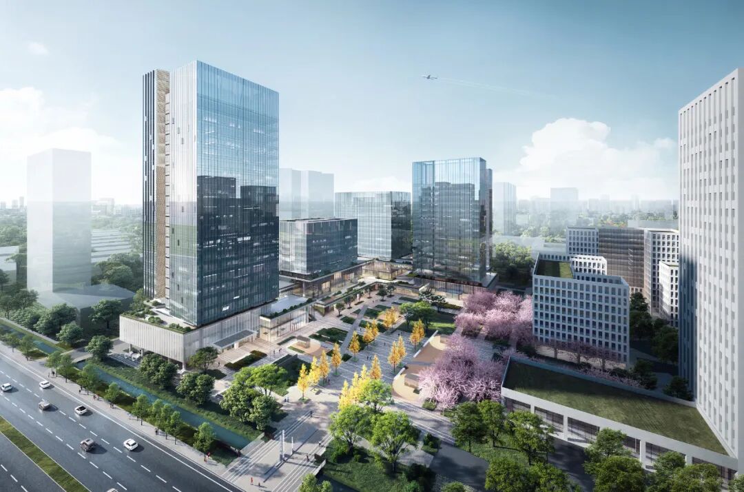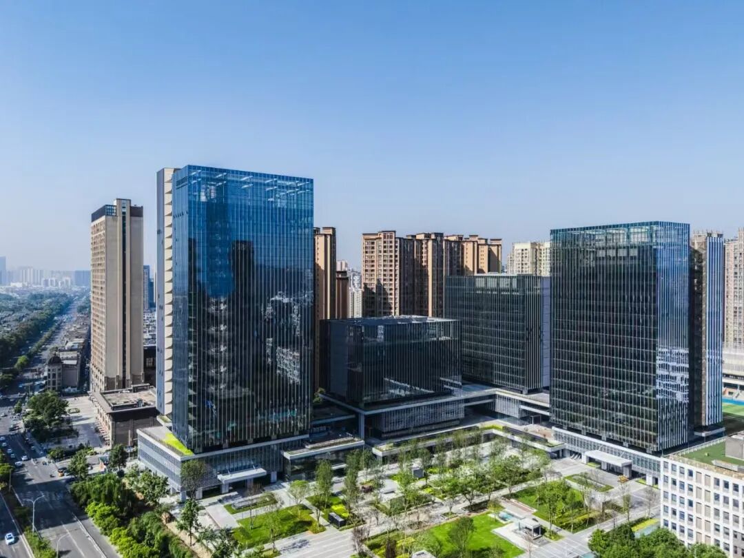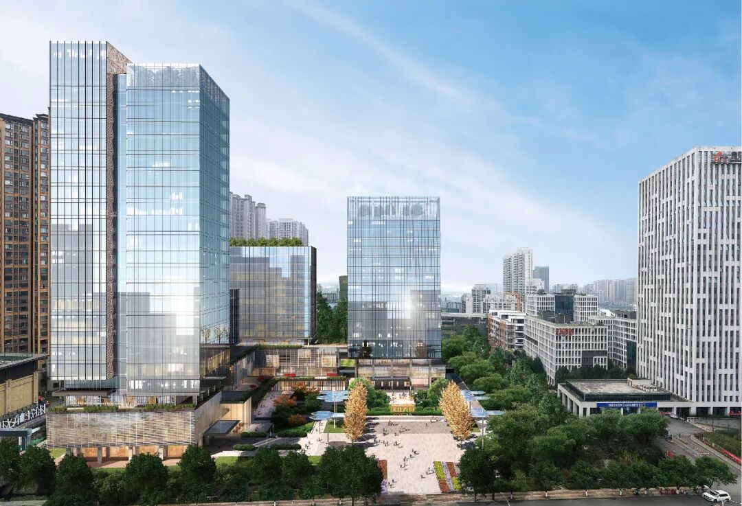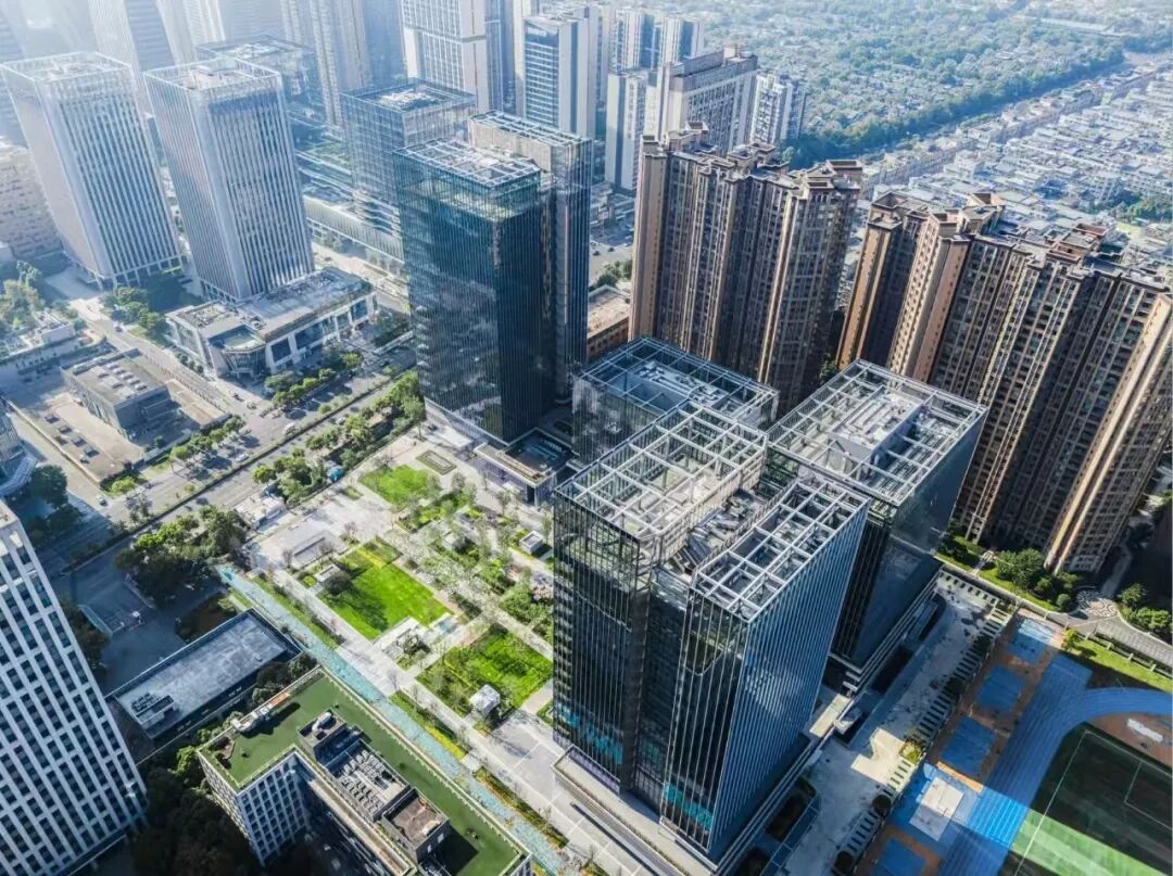 星耀·高新智谷位于成都高新区大源片区核心区域,东临益州大道,北接天府软件园G区,总建筑面积约17.2万平方米,定位为上市及拟上市企业总部园。项目与软件园G区形成“三塔楼、两聚落、一广场”的整体格局,通过L形共享空间串联建筑组团,打造绿色公共服务轴。园区紧邻地铁5号线民乐站、1号线天府五街站,未来地铁16号线(成都市五期规划)站点将直连项目,交通网络发达,区位优势显著。