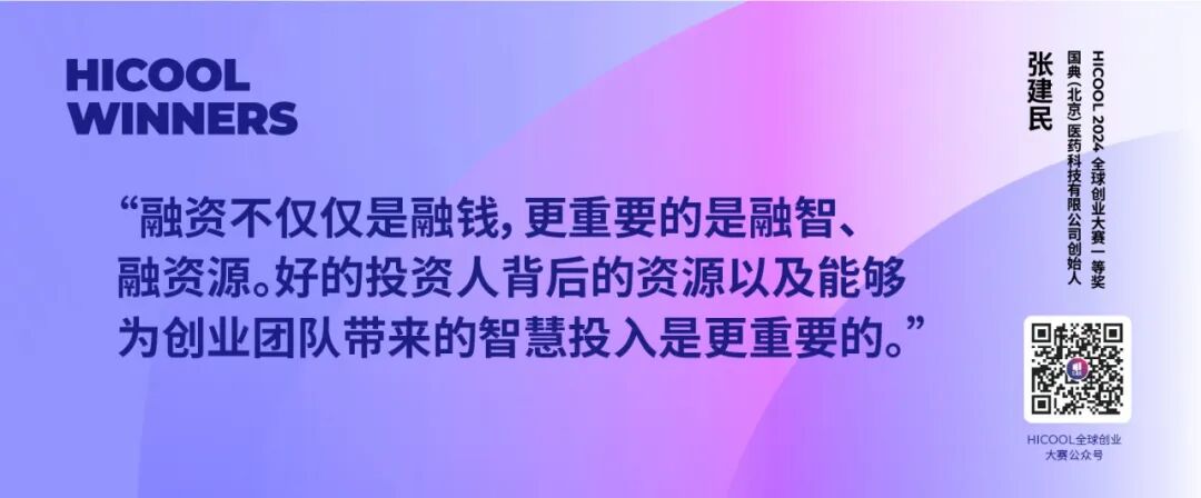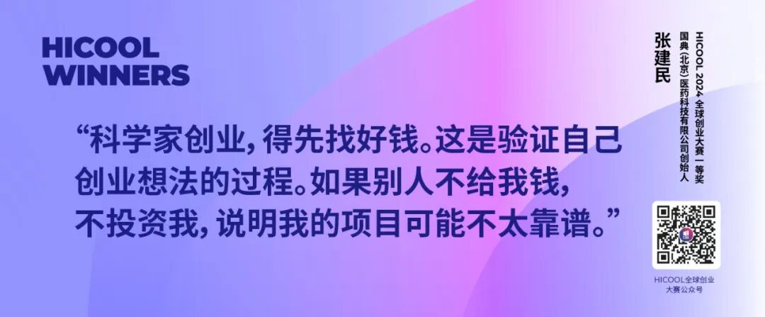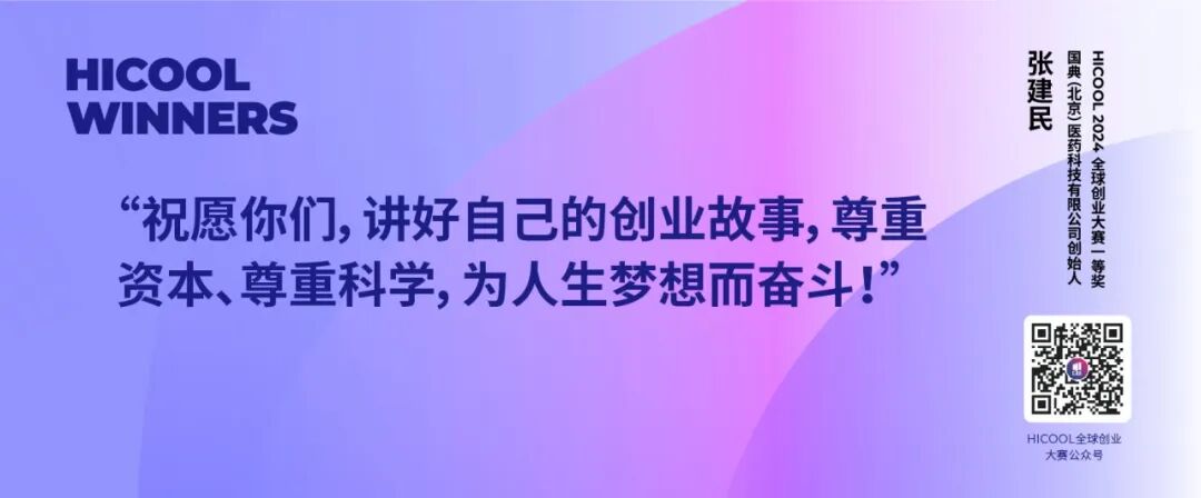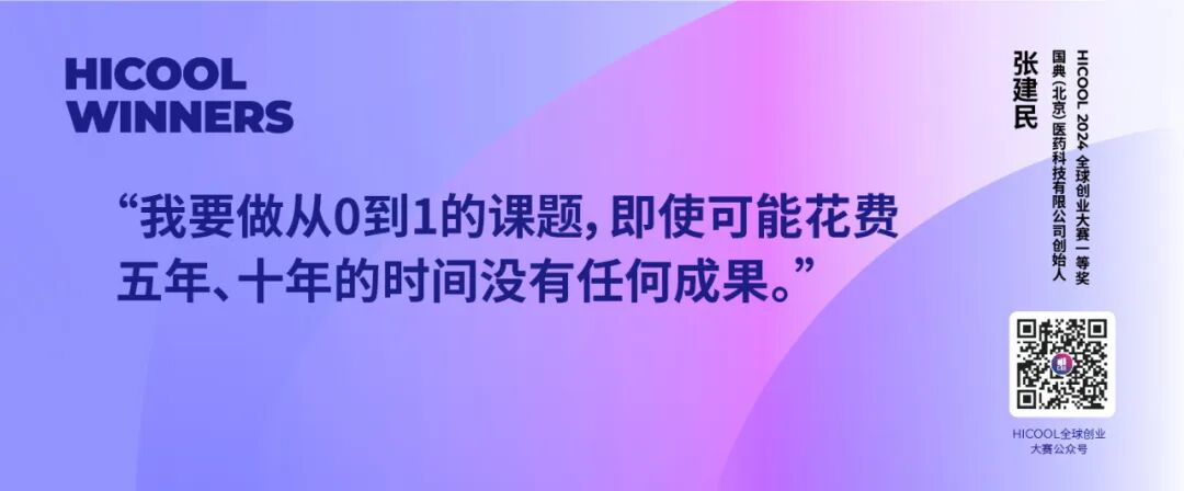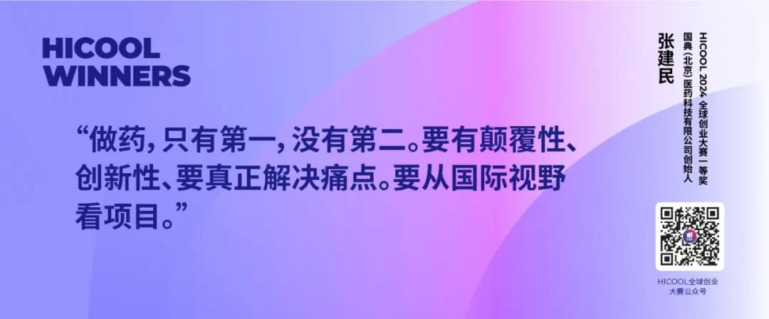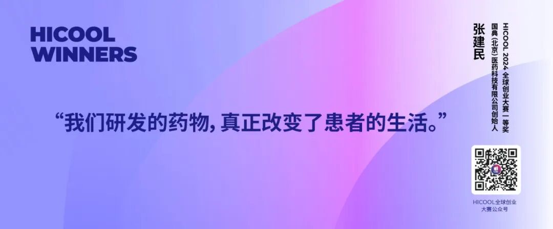 “张老师是我们年轻一代的榜样!”2024年,在公司药物研发专家王靓博士的极力推荐下,张建民报名了HICOOL全球创业大赛,“HICOOL大赛是我创业七年来,第一次参加的比赛活动。王靓博士深入调研过,告诉我HICOOL大赛第一水平很高,第二非常公平公正,第三也是最重要的,能为公司带来很多赋能。”如今,通过HICOOL,越来越多投资人、投资机构发现了“国典医药”这家宝藏公司。