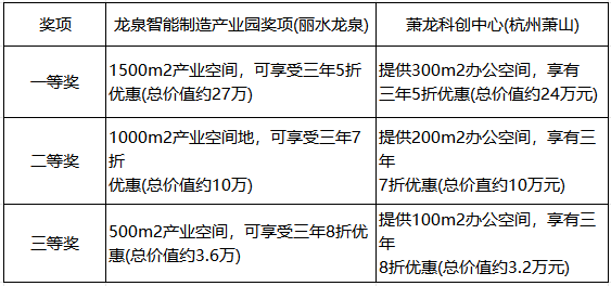 本次大赛获奖并在龙泉产业化的项目符合绿谷精英申报要求的,由龙泉市重点推荐优先参加绿谷精英评审,最终入选"绿谷精英”重大、A类、B类、C类创业项目分别给予1000万元、500万元、300万元、150万元及以上财政支持或3000万元、1500万元、900万元、450万元及以上基金投资。